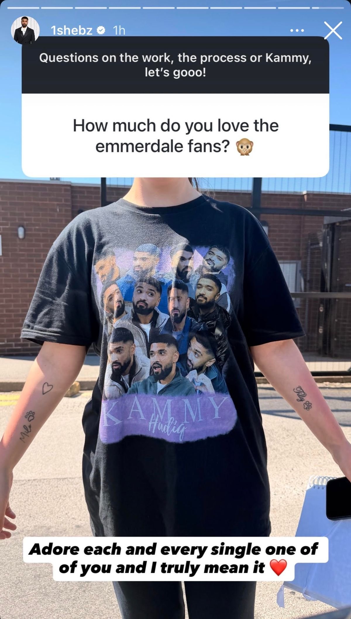 Depois de rapidamente se tornar o favorito dos fãs de Emmerdale, Shebz acessou seu Instagram para responder algumas perguntas. Quando alguém perguntou “o quanto você ama os fãs de Emmerdale”, Shebz respondeu rapidamente.